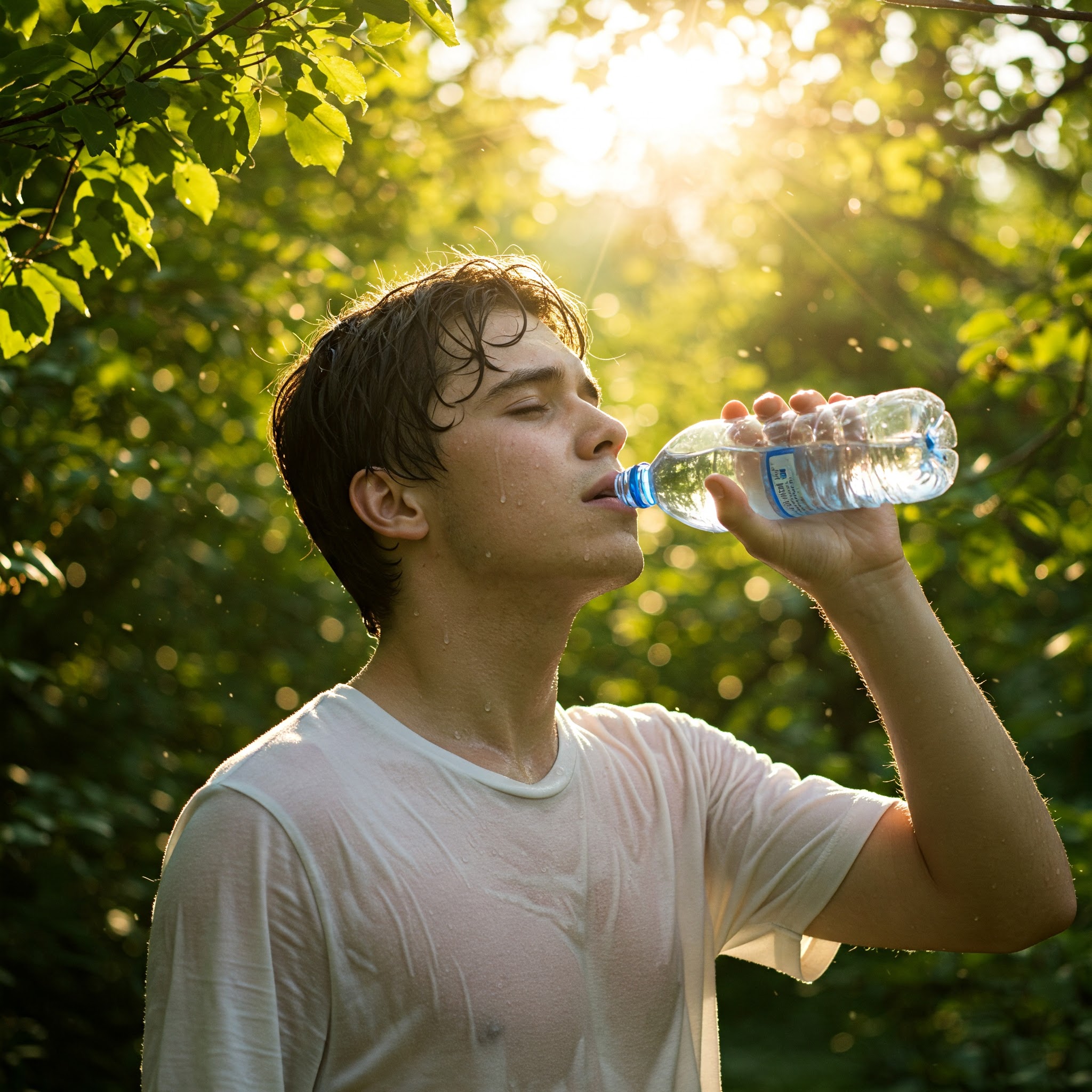 Sıcaktan Bunalıp Su İçen Kampçı (Yapay zeka ile oluşturuldu)
