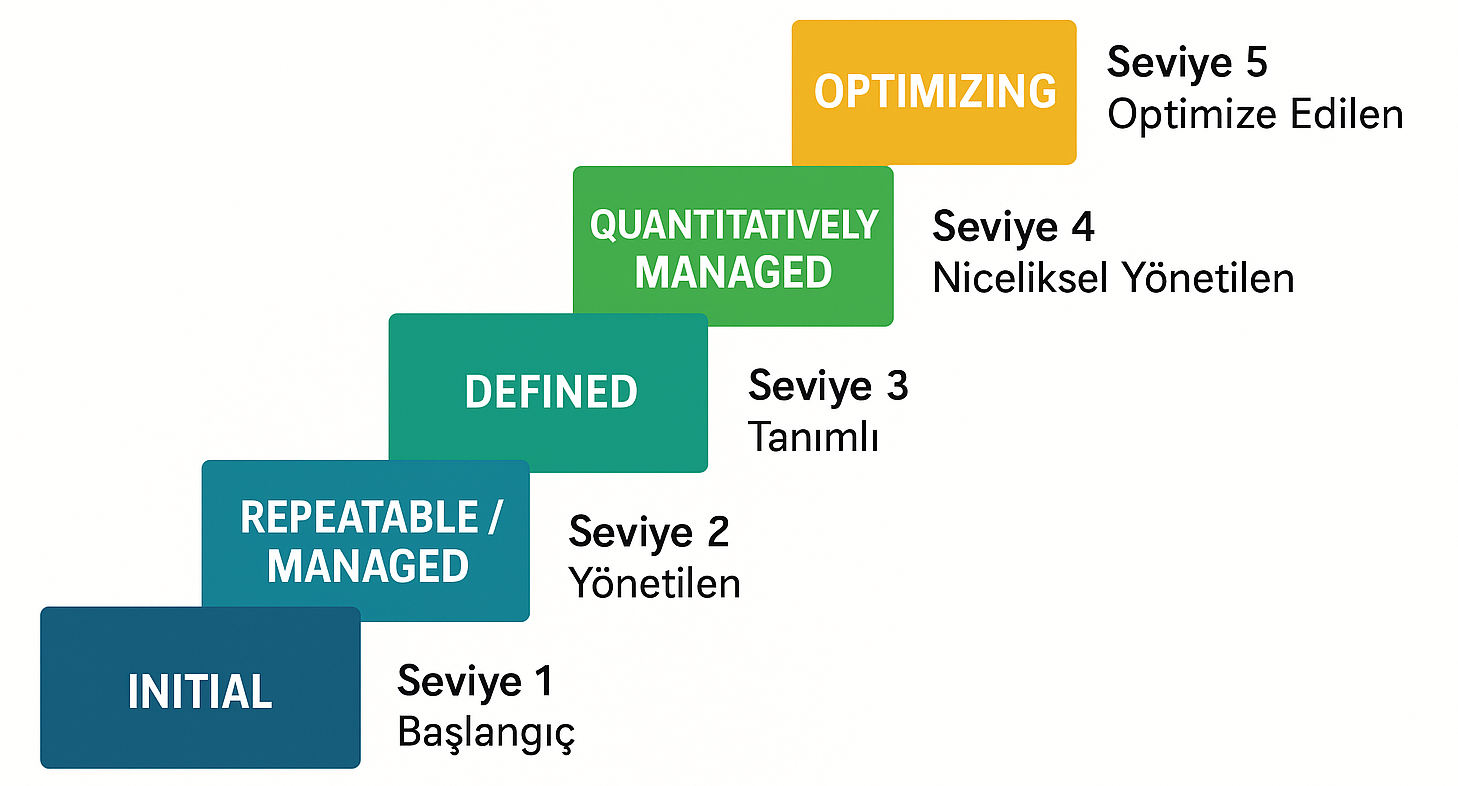 - Aşamalı Gelişim: Organizasyonel olgunluk bir anda sağlanamaz; kademeli adımlarla inşa edilir. Her seviye bir öncekinin üzerine yapı taşları ekler.