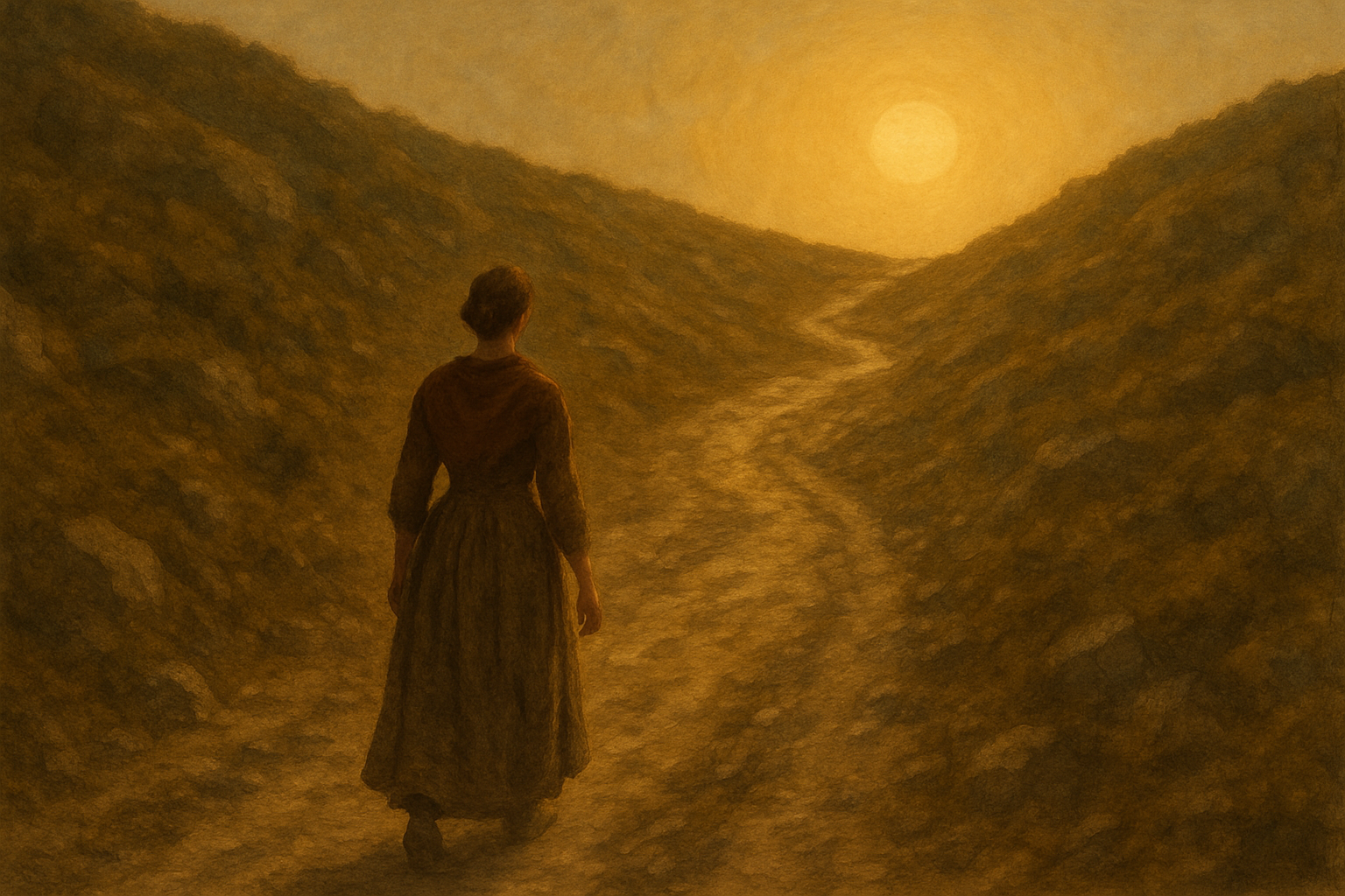 kadın, engebeli ve yokuş bir patikada ilerliyor. Yolun sonunda, ufukta parlayan güneş tüm sahneyi altın tonlarına boyarken, yolculuk zorlu ama umut dolu bir geleceğe işaret ediyor. (Görsel Yapay Zeka ile Oluşturulmuştur.)