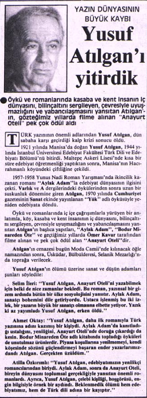 Yusuf Atılgan'ın Ölüm Haberi, 10 Ekim 1989 (Milliyet Gazetesi)