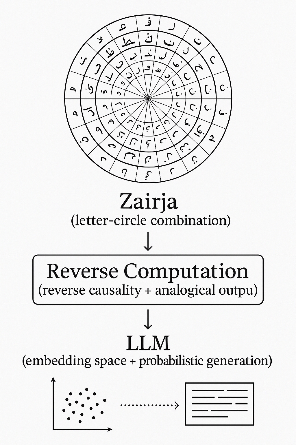 Modern büyük dil modelleri (GPT, PaLM, Claude, vb.) yüksek hacimli metin verilerini işleyerek olasılıksal dil üretimi yaparlar. Bu üretim süreci deterministik değil, bağlamsal ve istatistiksel ilişkilere dayanır. Zairja da benzer şekilde kelimelerin ve harflerin rastlantısal birleşimleriyle potansiyel anlam uzayları üretir. Bu yönüyle Zairja, LLM’lerin temel yapı taşlarından biri olan “embedding space” (anlam vektör uzayı) yaklaşımıyla örtüşür.