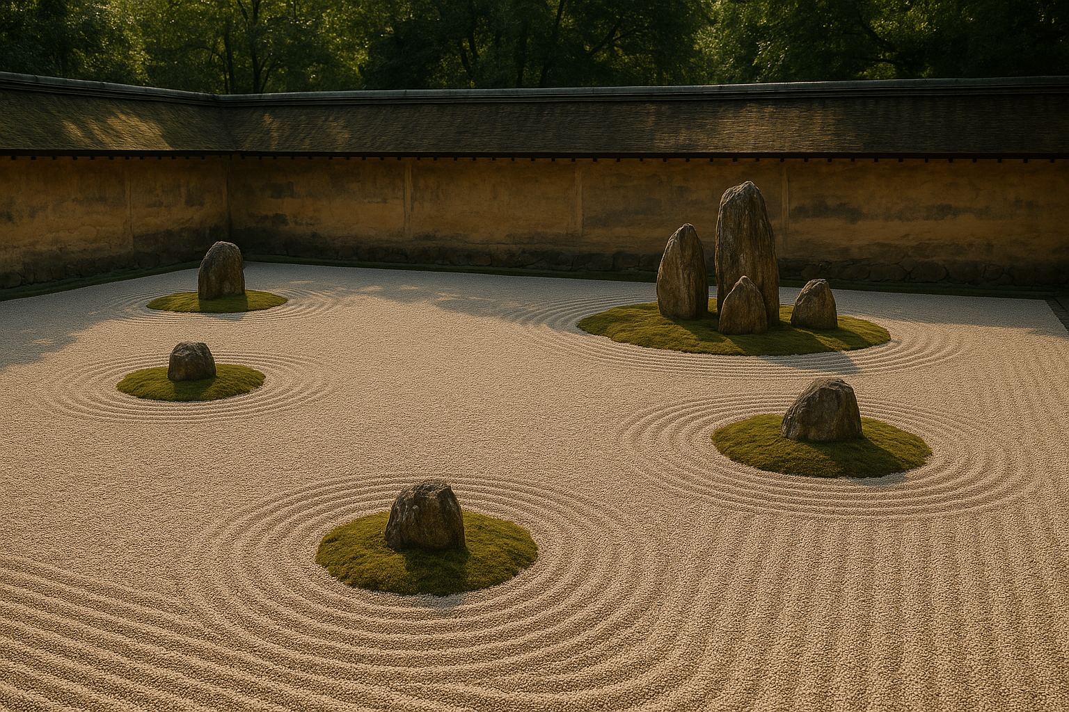 Ryōan-ji, Zen bahçesi, yaklaşık 248 m²’lik dikdörtgen bir alanda düzenlenmiş, 15 taşın beş grup hâlinde yerleştirildiği kuru taş (karesansui) bahçesidir. Taşlar, hiçbir seyir noktasından tamamı aynı anda görülemeyecek şekilde konumlandırılmıştır. Taşların etrafındaki çakıl yüzeyi düzenli biçimde tırmıklanmış, çizgisel ve dairesel desenlerle su hareketi simgelenmiştir.