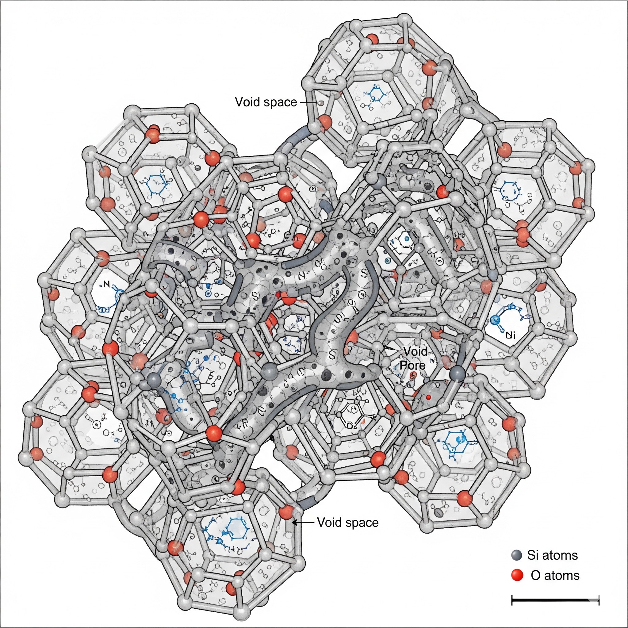 Şematik olarak bir zeolit kristalinin moleküler kafes yapısı, gözenekli kanalları ve boşlukları göstermektedir. (Yapay Zekâ ile Oluşturulmuştur.)